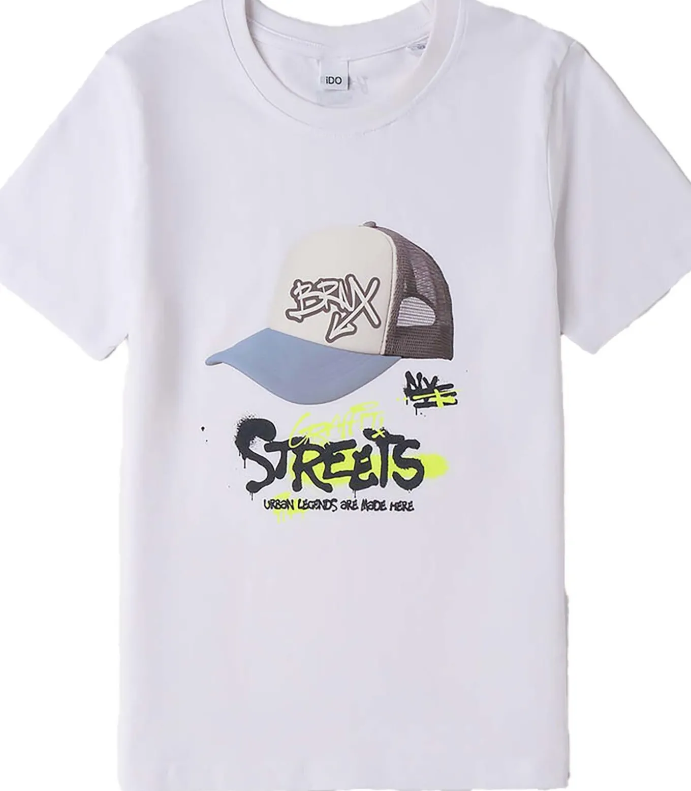 Kleur: Optisch wit Samenstelling: 100% katoen Mouwen: kort Details: T–shirt van zuiver katoenen jersey met een urban–geïnspireerde print op de voorkant die karakter toevoegt aan de look. Gebruik: Uitstekend voor vrije tijd en dagelijkse activiteiten, perfect te combineren met een jeans of casual pantalon.