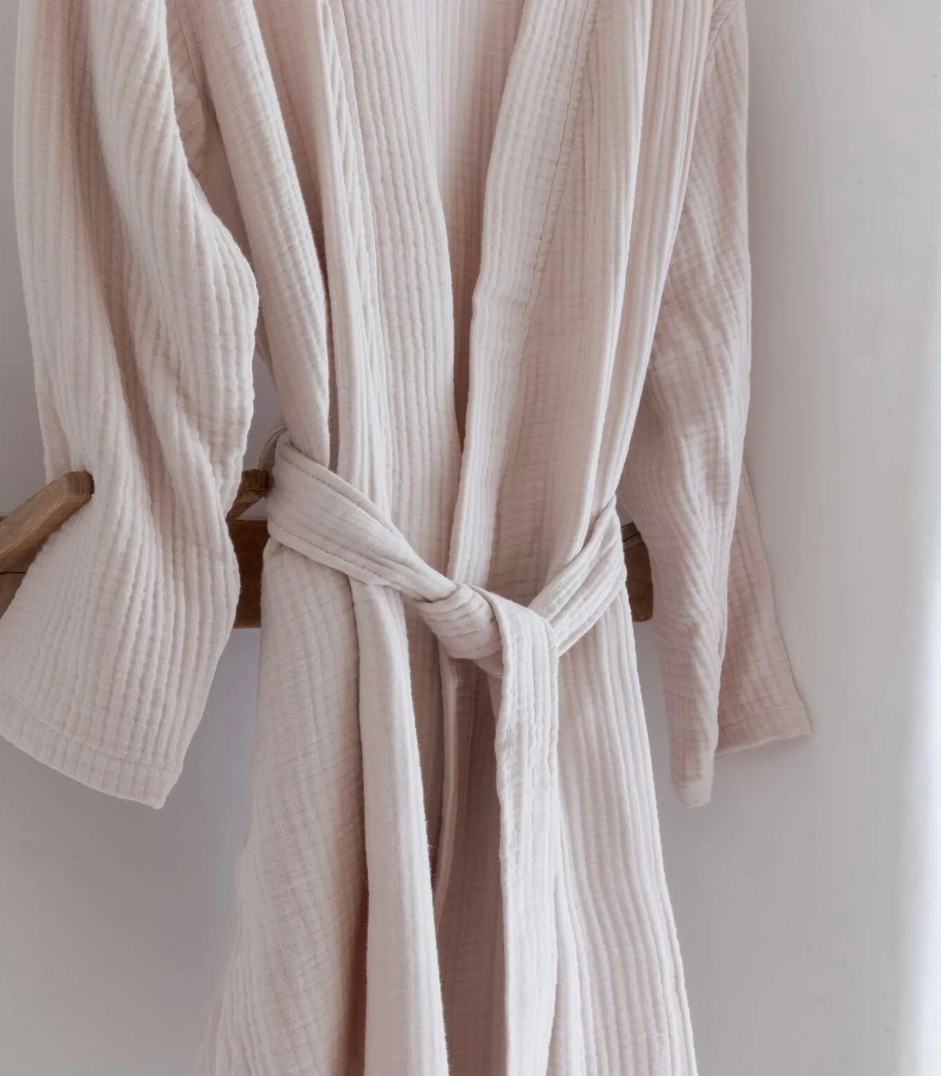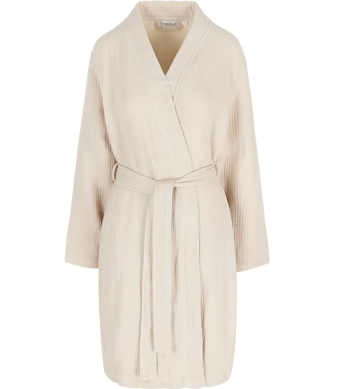 – Droger: de badjas mag in de droger, maar krimpt dan nog 5%. Dit is eigen aan de stof