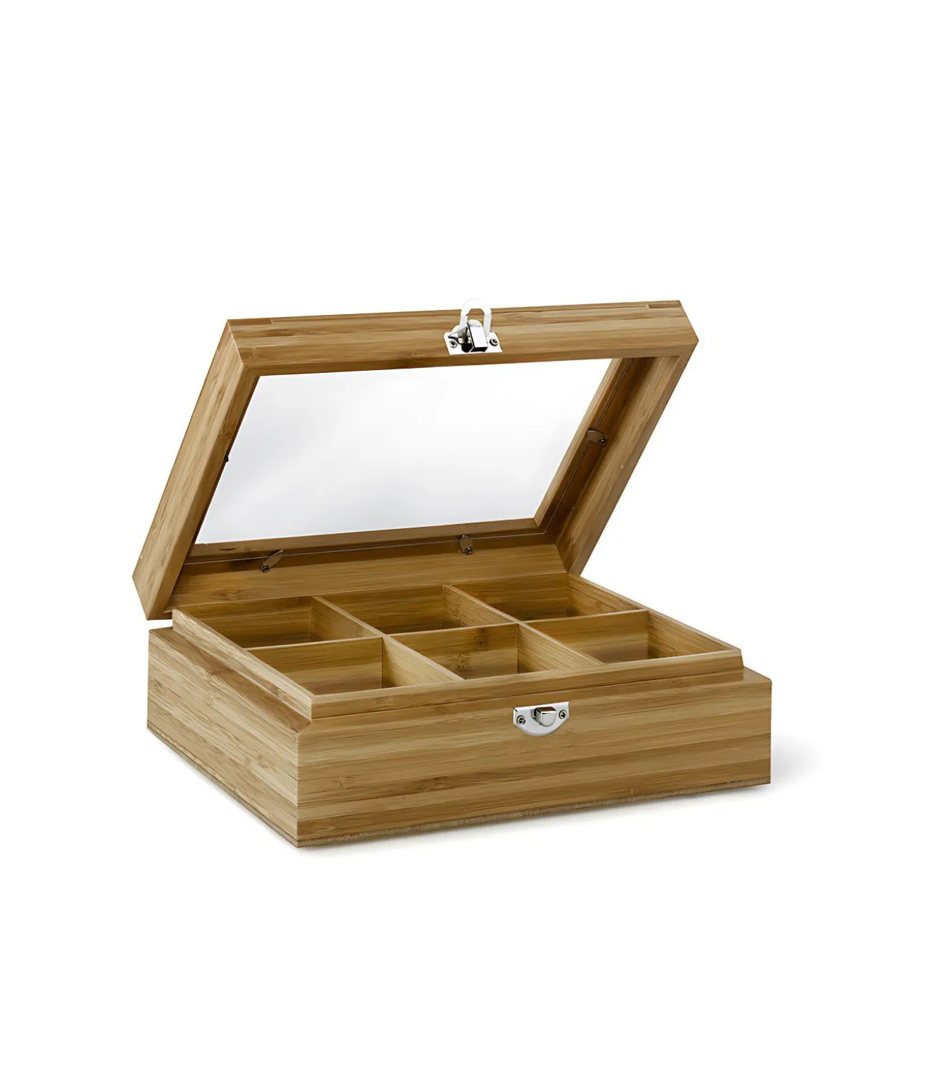 Theedoos met venster van bamboe hout met 6 vakken en venster.