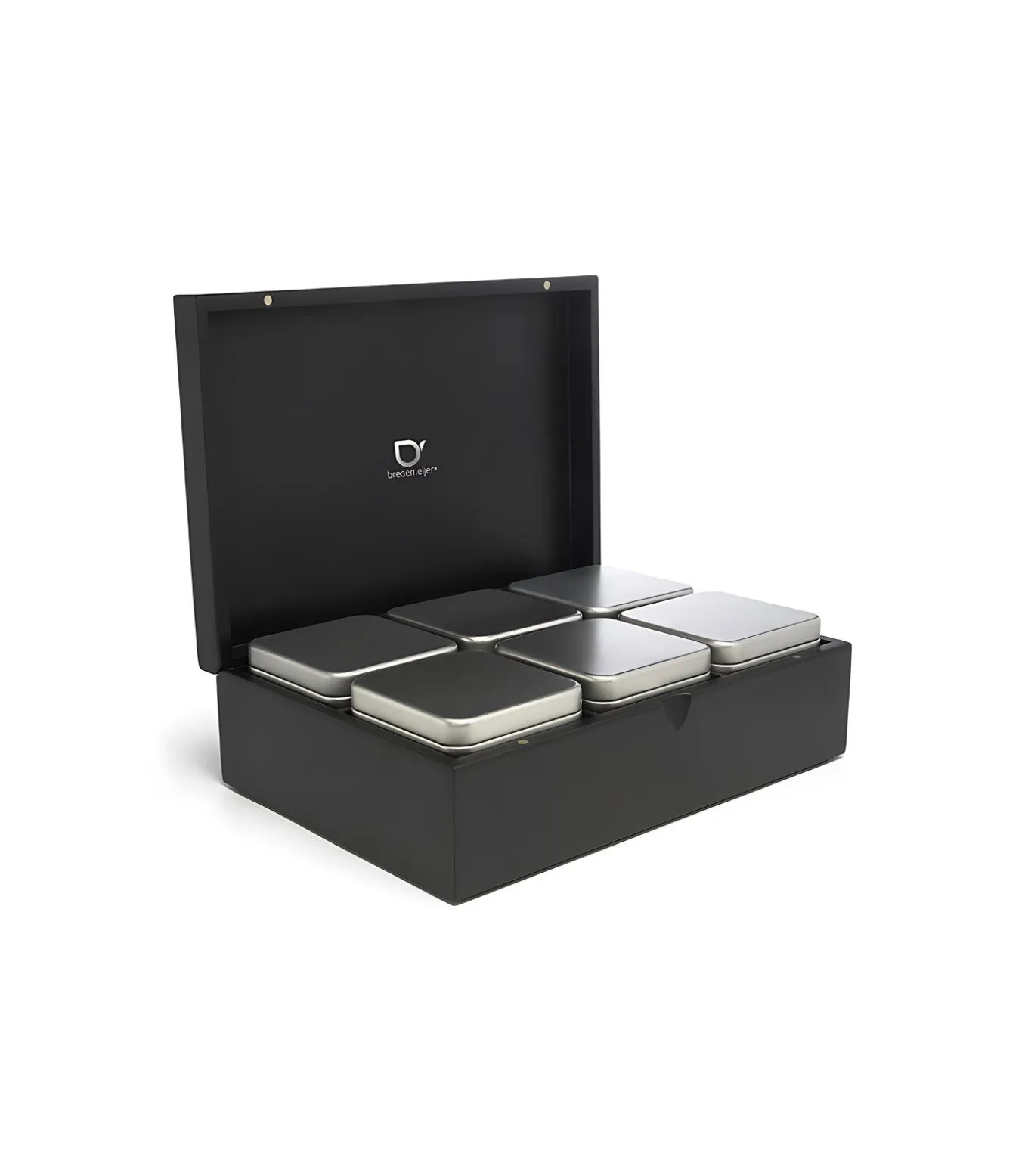 Bewaar je losse thee op stijlvolle wijze met deze zwarte Bredemeijer® theedoos. De theedoos is voorzien van 6 blikjes en speciaal ontwikkeld voor het bewaren van losse thee. Zo blijft de thee langer houdbaar en blijft de smaak behouden. Door het uitgeslepen gootje aan de voorzijde, is de deksel makkelijk te openenen. De theedoos is gemaakt van bamboe en heeft een elegante uitstraling door de matte zwarte kleur. Een musthave voor de echte theeliefhebber!
