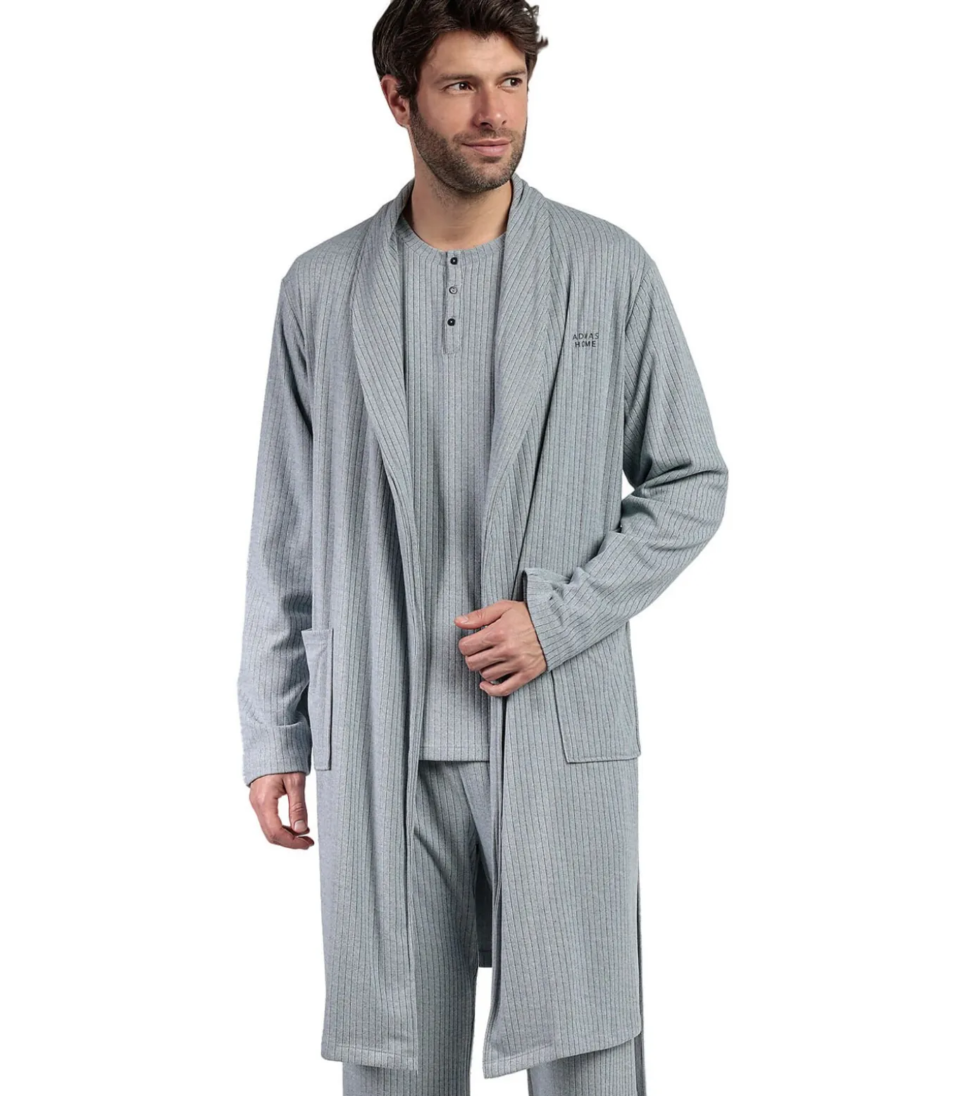 Een elegante, comfortabele badjas ontworpen om thuis in te ontspannen. Het vloeiende, rechte model biedt veel bewegingsvrijheid. Hij heeft lange mouwen en een ceintuur in de taille zodat je hem dicht kunt ritsen of open kunt laten voor een meer casual stijl. De ultrazachte stof is getextureerd met fijne ribbels, licht en soepel, voelt prettig aan en ademt. Klein reliëflogo op de buste. Perfect om thuis in te relaxen, over een pyjama of loungeset te dragen om ’s ochtends of ’s avonds warm te blijven zonder dat het te vol aanvoelt. Het is praktisch, zacht en stijlvol, ideaal voor een cocooning look die toch netjes en opgeruimd is. Geleverd in een Admas doos.[Jurk wordt apart verkocht. De pyjama en andere accessoires die het model op de foto’s draagt, zijn niet inbegrepen].
