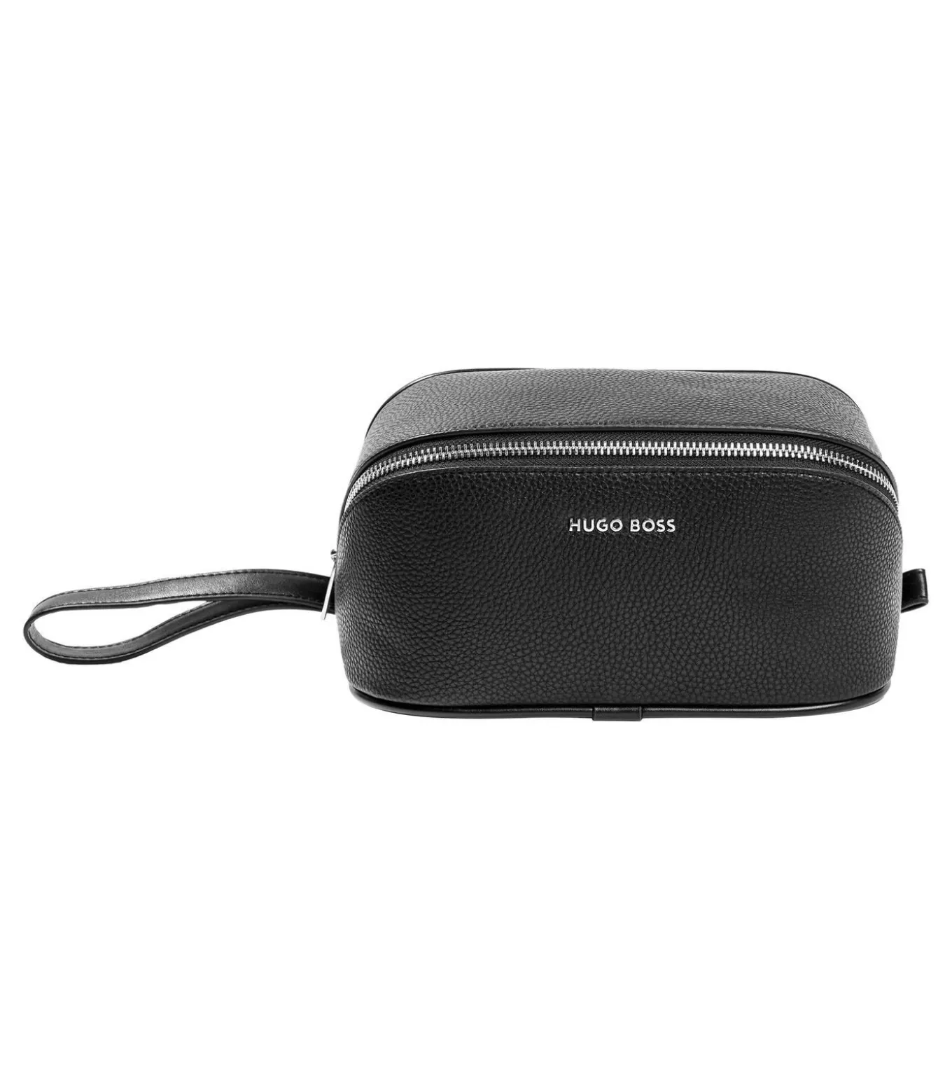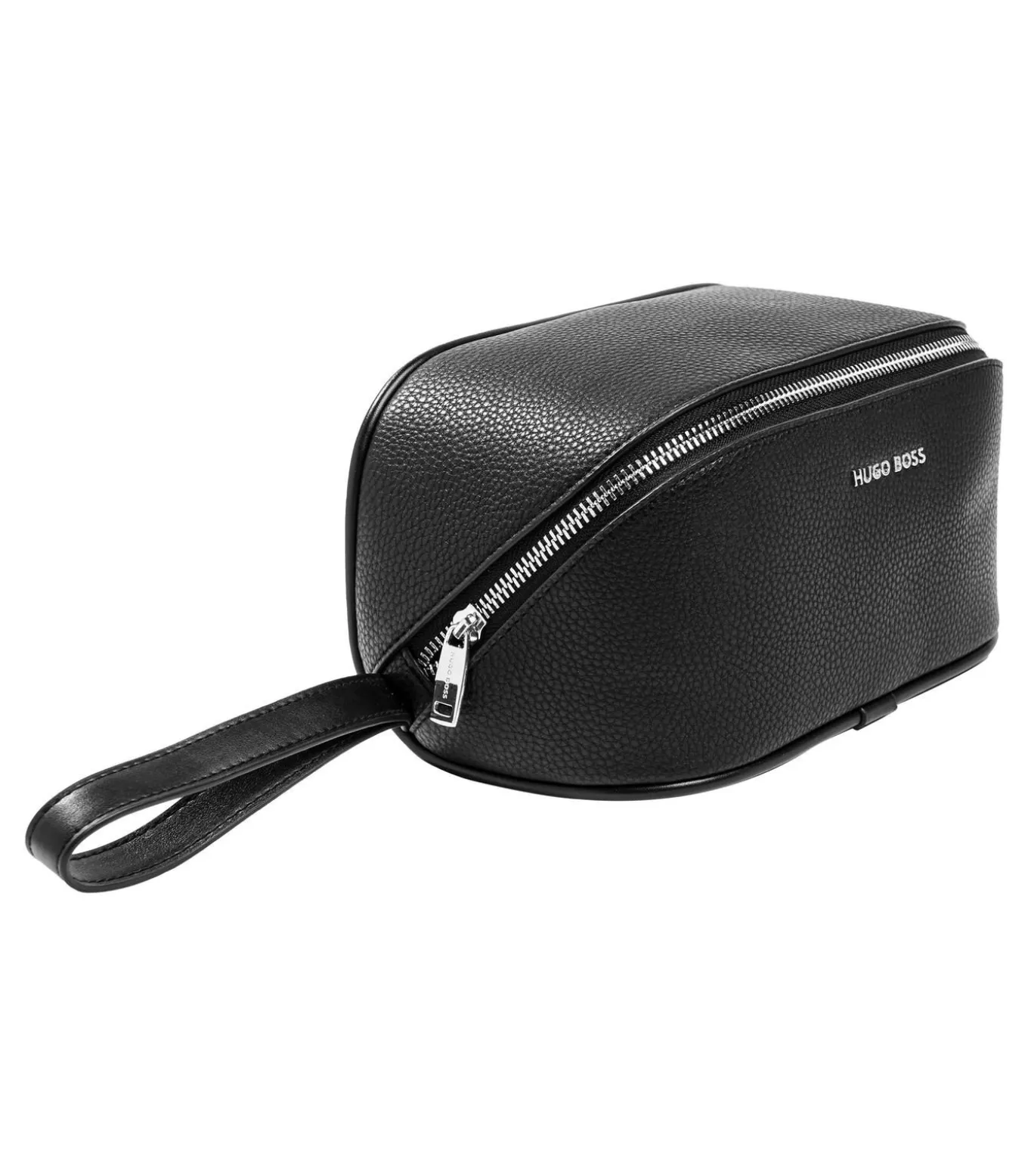 Introducing the HUGO BOSS Storyline Black Cosmetic Pouch, an embodiment of high–end fashion meeting functional utility. Crafted from premium–grade, black simili–leather, this pouch radiates a timeless sense of luxury and style. The leather is finely grained, presenting an elegant texture that feels as exquisite as it looks. A standout feature of this accessory is the innovative zipper design. Instead of the conventional straight opening, it features a distinct diagonal opening. Finished in chrome metal, the zipper not only offers a durable mechanism but also enhances the overall aesthetics of the pouch. The glossy metallic touch against the matte black leather offers a stylish contrast, adding an unexpected edge to the design.The pouch is fitted with a practical hand strap, ensuring it’s as handy as it is chic. The strap maintains the same black simili leather as the main body, making it a seamless addition to the overall design. Dimensions: 220 x 100 x 110 mm, Material: Polyester