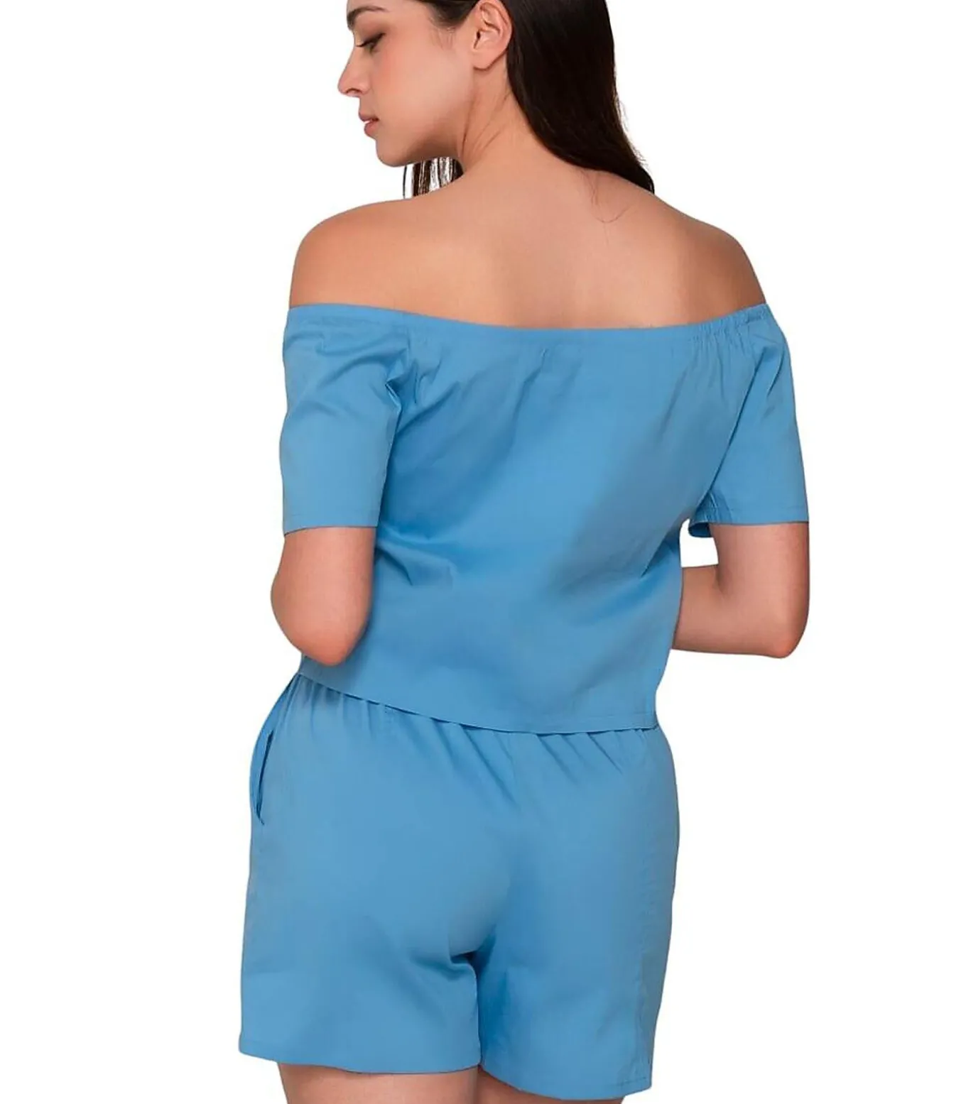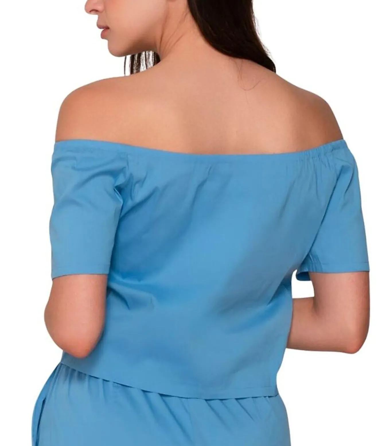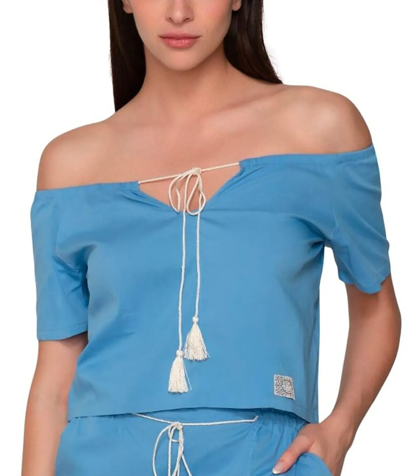 Zomertop met blote schouders voor een ontspannen, vrouwelijke stijl. Het model is recht en lichtjes losjes gesneden en biedt een comfortabel en flatterend silhouet. Dit model heeft een elastische halslijn die de schouders goed laat uitkomen en tegelijkertijd goede ondersteuning biedt. Een wit, gevlochten koord met twee kwastjes maakt de V–vormige opening aan de voorkant elegant af. Eenvoudige, aansluitende slipe mouwen. Kleine logopatch linksonder. Lichtgewicht, vloeiende stof van katoen en polyamide, perfect voor zomerse dagen. Deze top is ideaal om te dragen op vakantie, aan zee of voor een chique, casual zomeroutfit.[Top apart verkrijgbaar. Topje en broekje worden apart verkocht. Het broekje, de sieraden en andere accessoires die het model op de foto’s draagt, zijn niet inbegrepen].