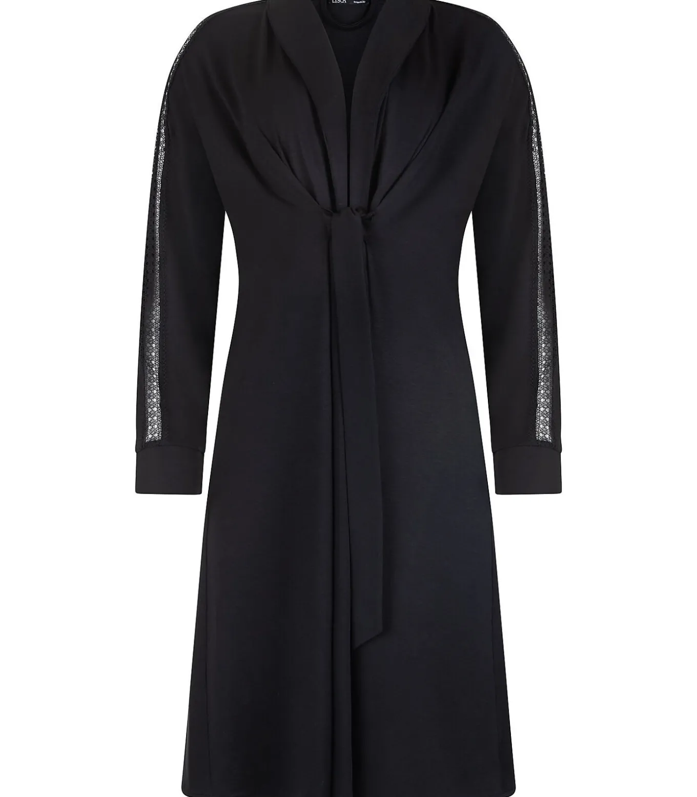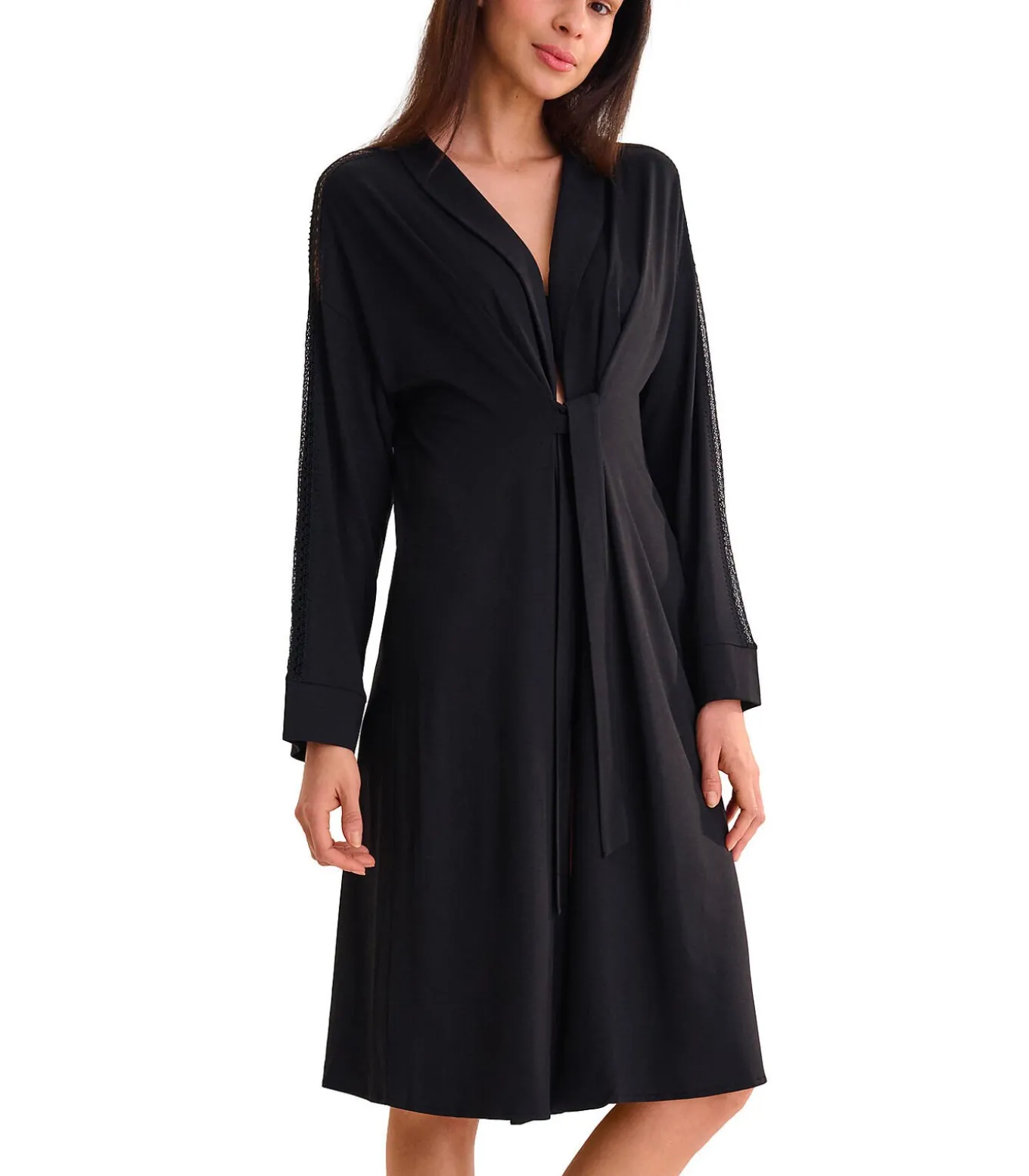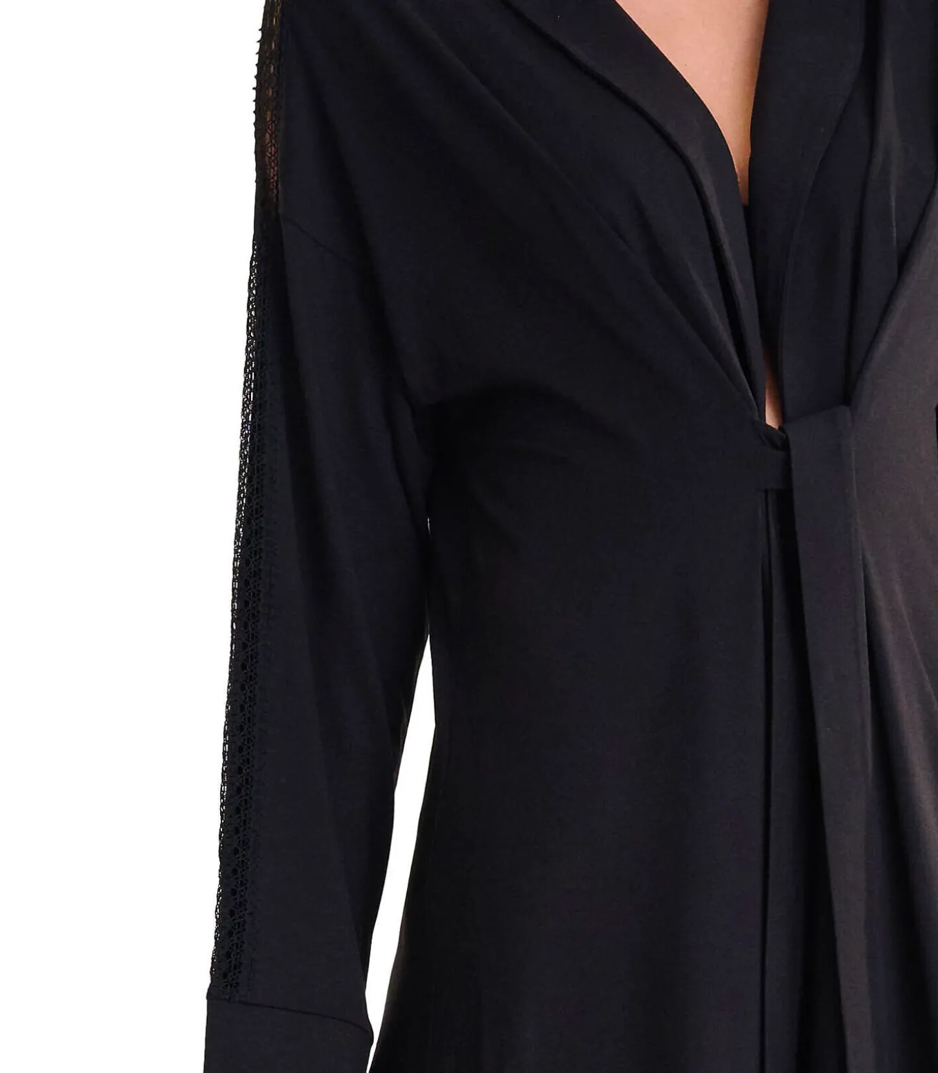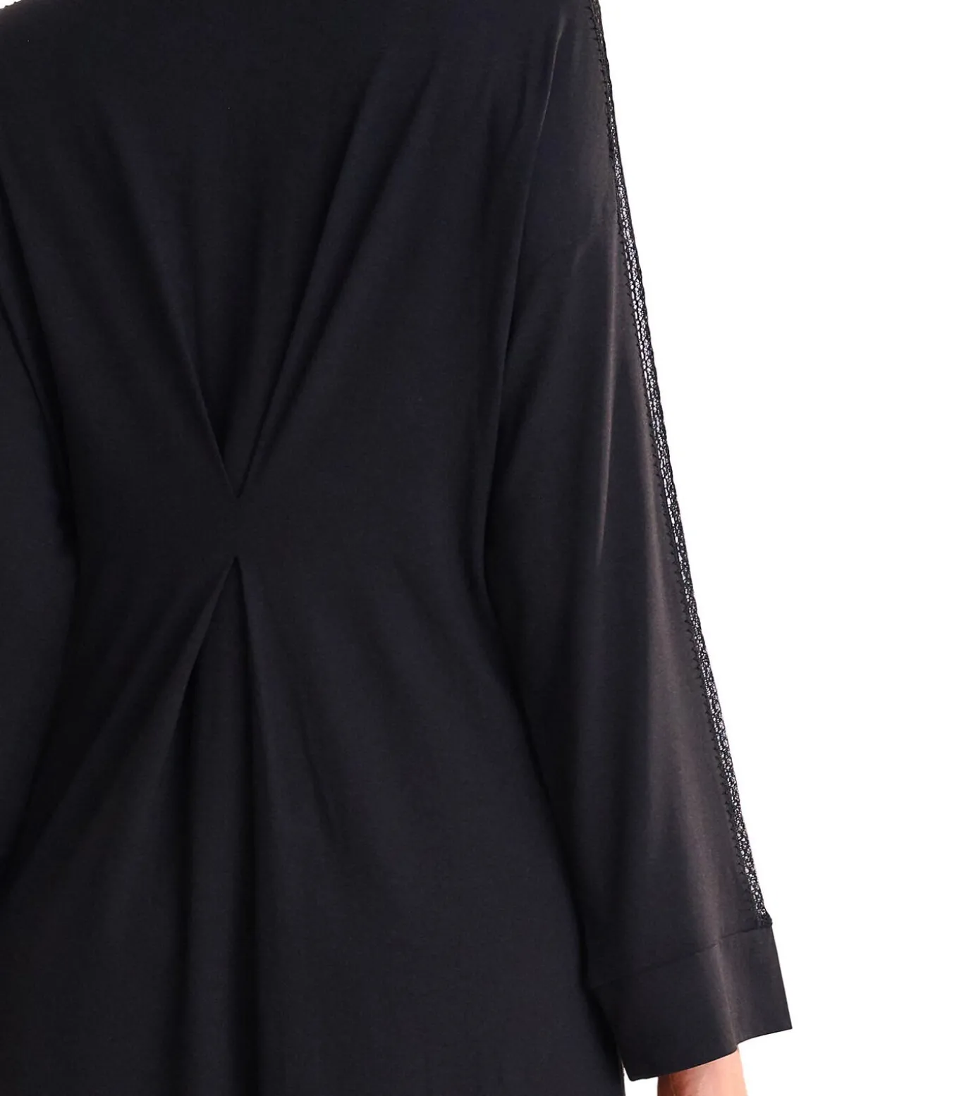Negligé met lange mouwen, sjaalkraag en sluiting net boven de taille. Ingenaaide plooien aan de voorkant, zijkanten en middenachter creëren een elegante lijn. Fijn kant langs de mouw zorgt voor een subtiele decoratieve touch. Lengte ca. 100 cm.