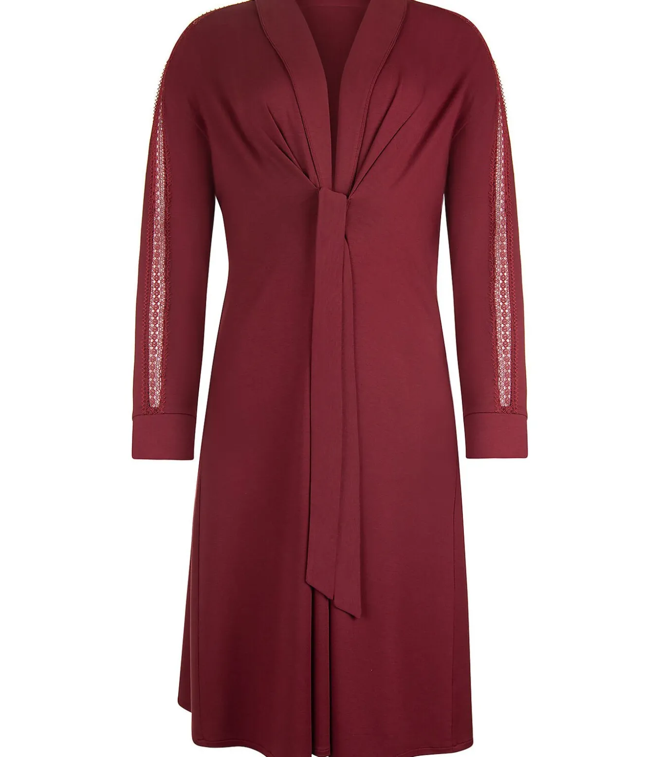 Negligé met lange mouwen, sjaalkraag en sluiting net boven de taille. Ingenaaide plooien aan de voorkant, zijkanten en middenachter creëren een elegante lijn. Fijn kant langs de mouw zorgt voor een subtiele decoratieve touch. Lengte ca. 100 cm.