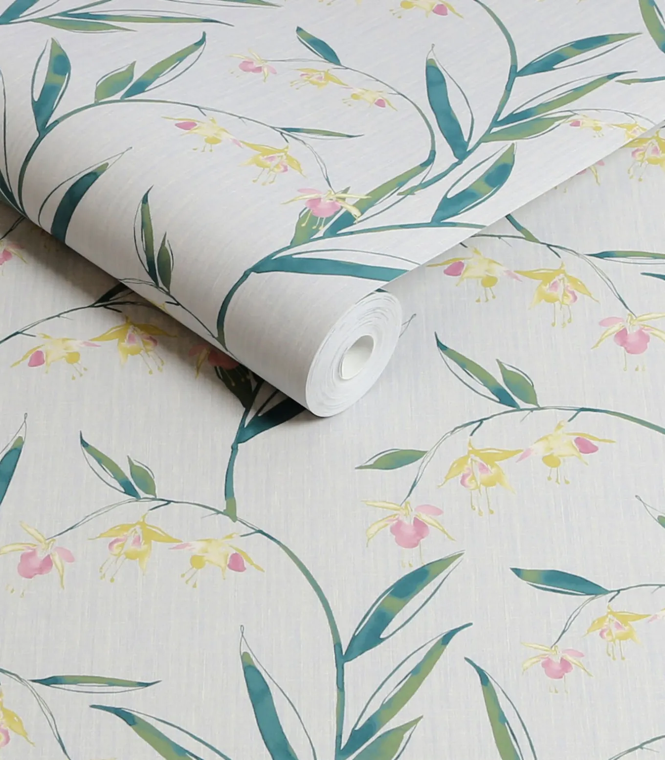 De Fullwell Fuchsia is een eigentijdse bloemenprint met gestileerde fuchsia bloemen met gebogen bladeren en stelen.
