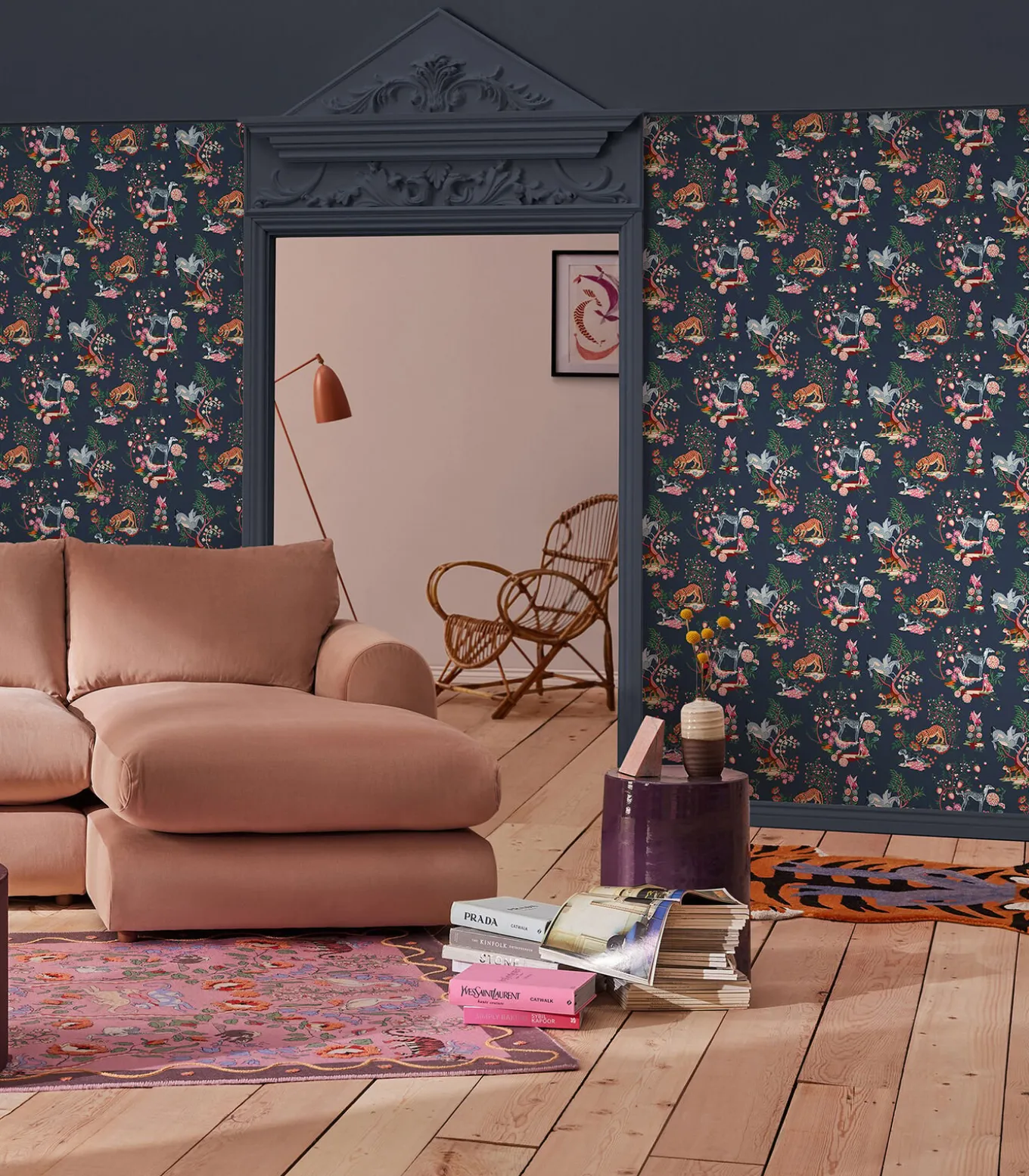 Maak fantasie werkelijkheid met Painted Kingdom Navy, dat een wereld van creativiteit en verbeelding tot leven brengt. Met een scala aan handgeschilderde dieren, van tijgers en apen tot mythische wezens zoals eenhoorns, vliegende varkens en blauwe en rode honden. Allemaal weergegeven in veelkleurige bolvormige ontwerpen, ingekapseld door grillige bomen, planten en bloemen, die ontzag en verwondering toevoegen aan dit unieke mooie ontwerp. Alles op een diep marineblauwe achtergrond, afgewerkt met een matte finish voor een moderne uitstraling.