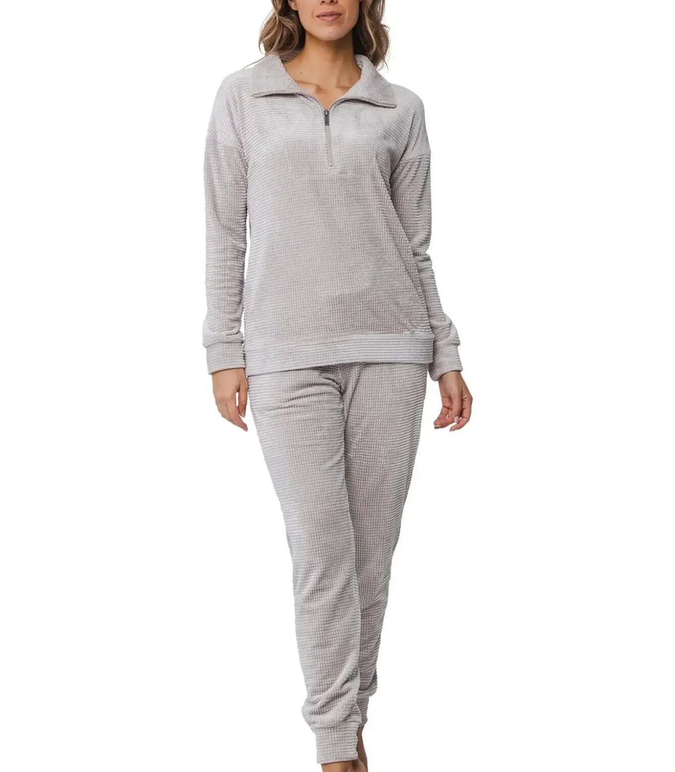 Het huispak is gemaakt van velours stof, waardoor het heerlijk zacht en warm aanvoelt.