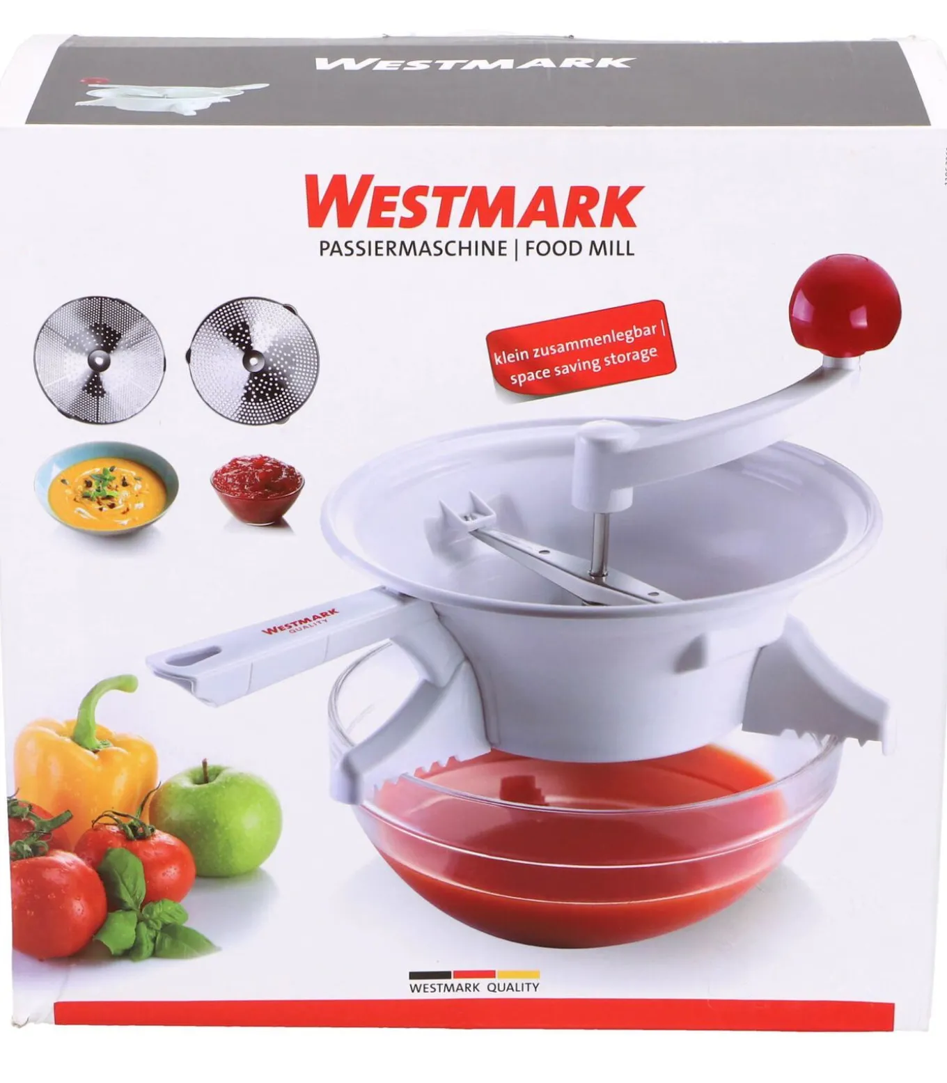 Westmark groentezeef kunststof – Passeerzeef 23cm wit keukenhulpMet de groentezeef van Westmark wordt het pureren van groenten en fruit een fluitje van een cent. Deze handige passeerzeef is gemaakt van stevig kunststof en roestvrij staal, waardoor hij niet alleen licht is, maar ook lang meegaat. Dankzij de twee verwisselbare schijven met grove en fijne gaatjes kun je zelf kiezen hoe fijn je je ingrediënten wilt pureren.De drie stabiele steuntjes zorgen ervoor dat de zeef stevig op schalen, kommen of potten blijft liggen, zodat je zonder geknoei aan de slag kunt. Na gebruik klap je de Westmark groentezeef eenvoudig dicht, zodat hij weinig ruimte inneemt in je keukenkastje. En schoonmaken? Dat doe je gewoon in de vaatwasser!Extra informatieInclusief twee verwisselbare schijven voor grof en fijn purerenStevige grip dankzij drie stabiele steuntjesCompact op te bergen en vaatwasserbestendigGemaakt van kunststof en roestvrij staal