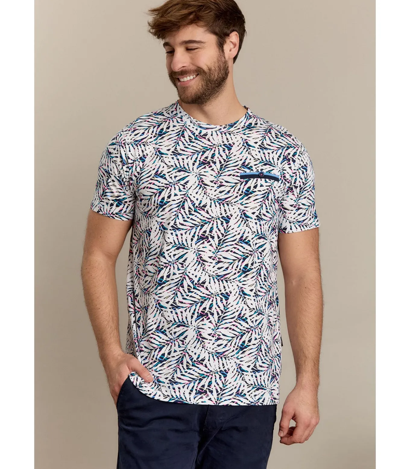 Kies voor een frisse en trendy look met dit witte heren t–shirt met plantenmotief, geïnspireerd op de natuurlijke schoonheid van Como. Dit t–shirt is gemaakt van 100% katoen en biedt optimaal comfort en een flatterende rechte snit. Het ontwerp met bladprint zorgt voor een vleugje natuur en frisheid, terwijl de effen ronde hals en gestileerde geribbelde randen een subtiel vleugje detail toevoegen. Doorgestikte zomen en randen zorgen voor een nette afwerking, terwijl korte mouwen voor een casual touch zorgen. Bestel nu en voeg een musthave toe aan je zomergarderobe!