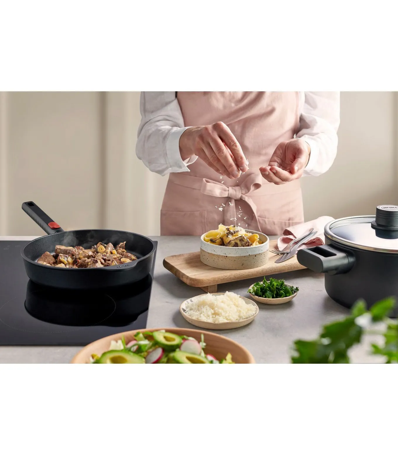 Het innovatieve ontwerp van de afneembare handgreep biedt talloze voordelen, zoals gemakkelijke plaatsing in de oven, gootsteen en vaatwasser, en efficiënt stapelen in de keuken.