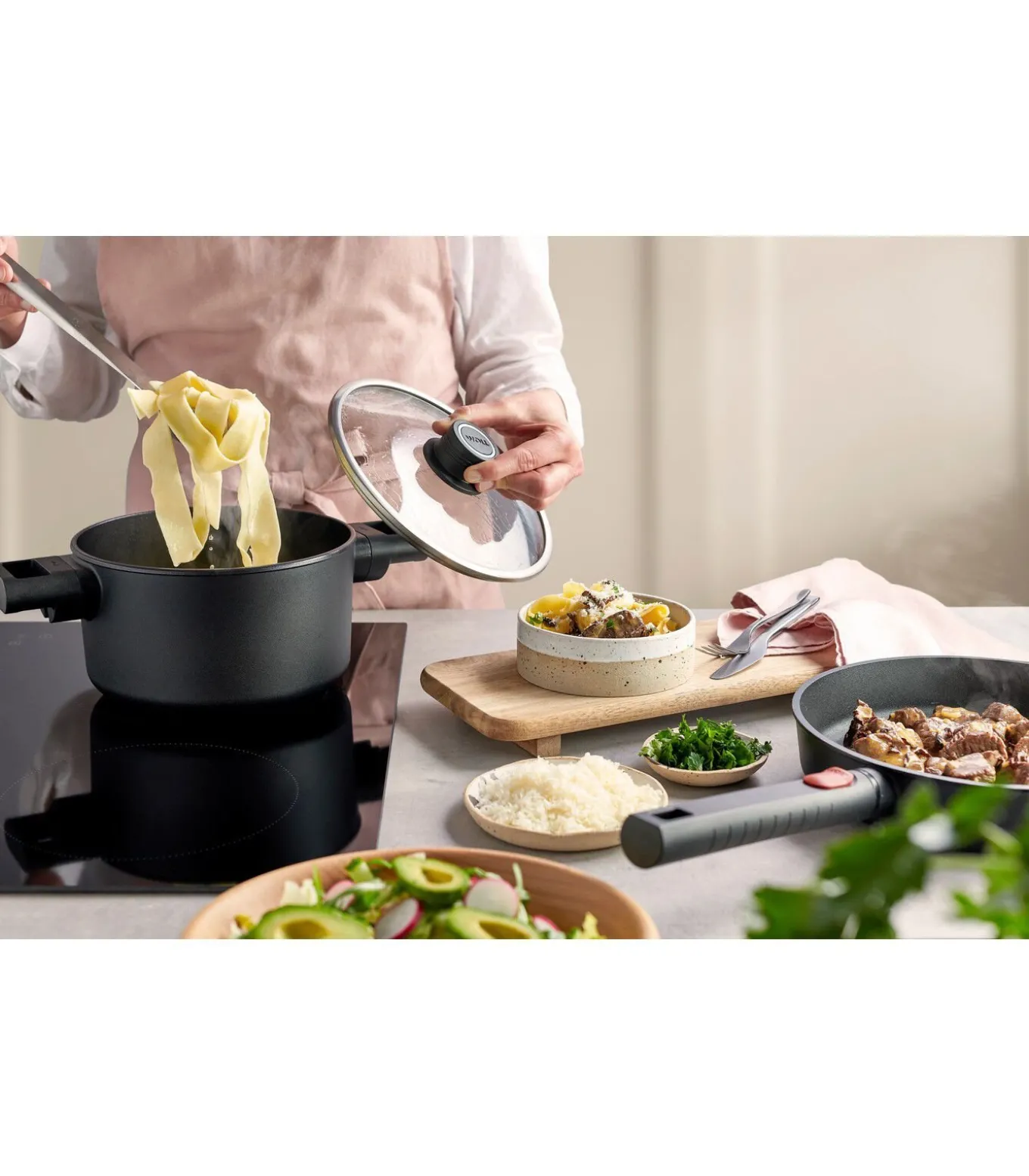 Dankzij de volledige inductiebodem warmt de pan snel en gelijkmatig op, wat tijd en energie bespaart. De inductiekookplaten benutten de warmte optimaal, waardoor uw kookervaring efficiënt en aangenaam is. De pan is geschikt voor alle warmtebronnen, inclusief inductie.