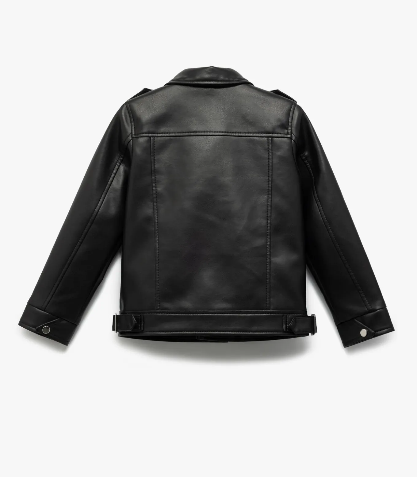 Geef je kind een stoere en moderne look met deze zwarte biker jas van kunstleer. De jas is voorzien van een kruiskraag en lange mouwen, en biedt praktische zakken met ritsen. Ideaal voor dagelijks gebruik of speciale gelegenheden, deze jas combineert stijl en comfort voor elk seizoen.