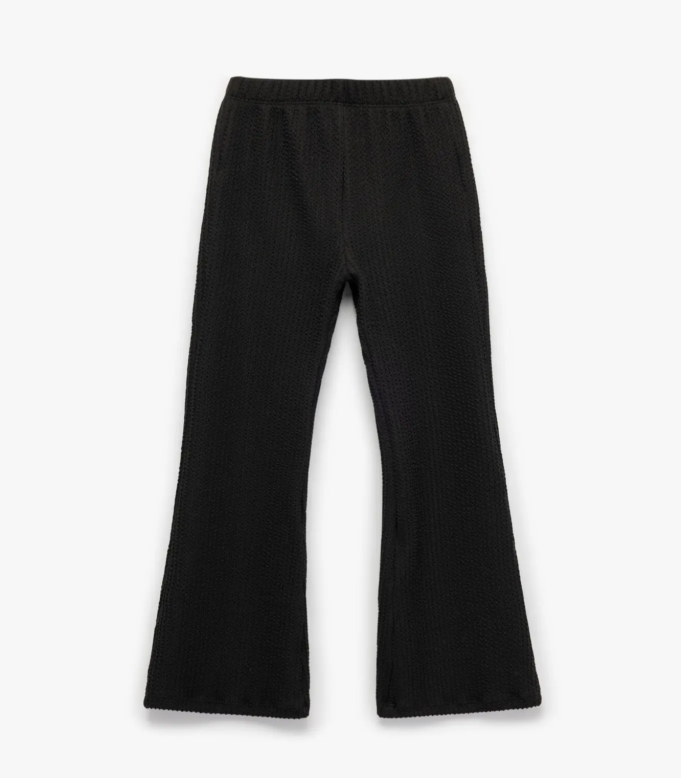 Deze zwarte kinderpantalon met gestructureerde stof biedt een moderne uitstraling en ultiem draagcomfort. De elastische tailleband zorgt voor eenvoudig draaggemak en de flared pijpen geven een stijlvolle look. Perfect voor dagelijkse avonturen waarbij comfort en stijl samenkomen.